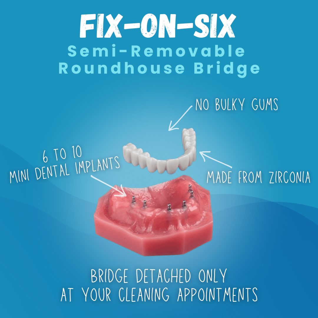 Yes, we offer a fantastic alternative to the All-on-4 procedure, which we call “Fix-on-Six” using mini dental implants. This innovative approach is not only less invasive but also more cost-effective compared to traditional All-on-4 treatments. The Fix-on-Six method utilizes mini dental implants to securely anchor your new teeth. This process is designed to be less intensive, reducing discomfort and speeding up recovery time.